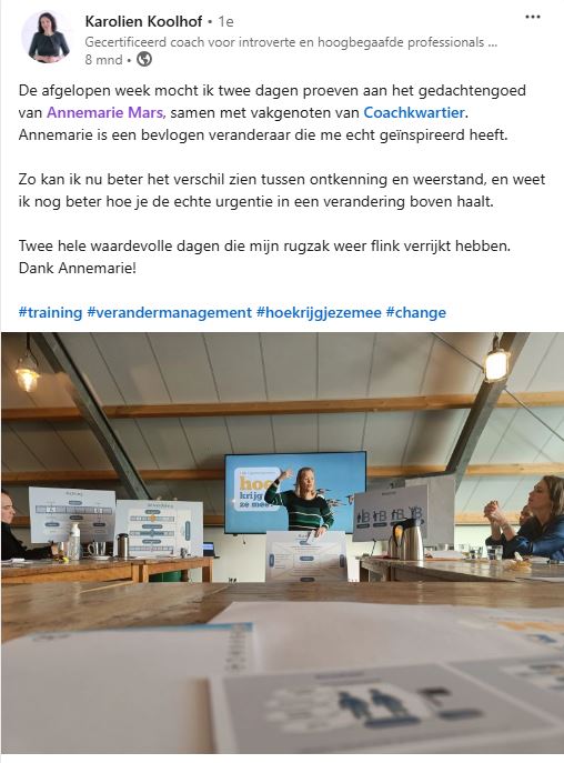 Alle opleidingen zijn uit te breiden met een 1 op 1 supportbundel van Coachkwartier. Meerdere ervaren verandercoaches zijn opgeleid in het Hoe krijg je ze mee?-gedachtengoed om veranderaars te helpen met hun verandervraagstukken.