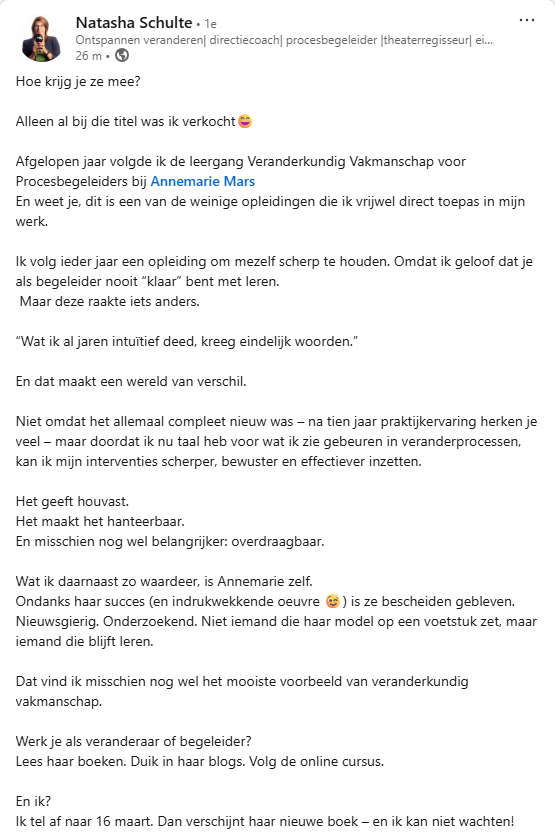 Het programma Verandervakmanschap zal – na vijf edities – in het najaar van 2026 in een nieuw format worden aangeboden. Gericht op een bredere doelgroep en vanuit het nieuw te verschijnen boek. Begin 2026 zijn naar verwachting de data bekend zodat de voorinschrijving kan starten. Als je op de hoogte gehouden wil worden, stuur een mail aan annemieke.kersting@forachange.nl